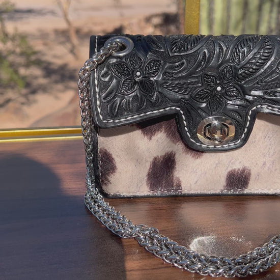 Black hand floral tooled top with a mix of cow print, say less. It has an adjustable designer chain. You have the option to have a short chain or long chain when wearing this. These are NFR APPROVED! With its clear material on the sides and the bottom of this clutch!