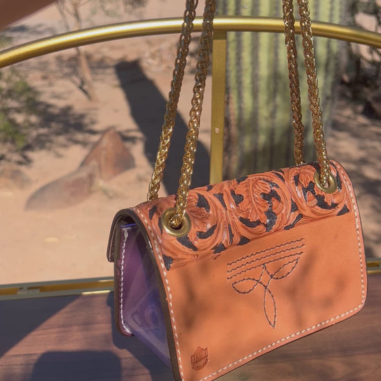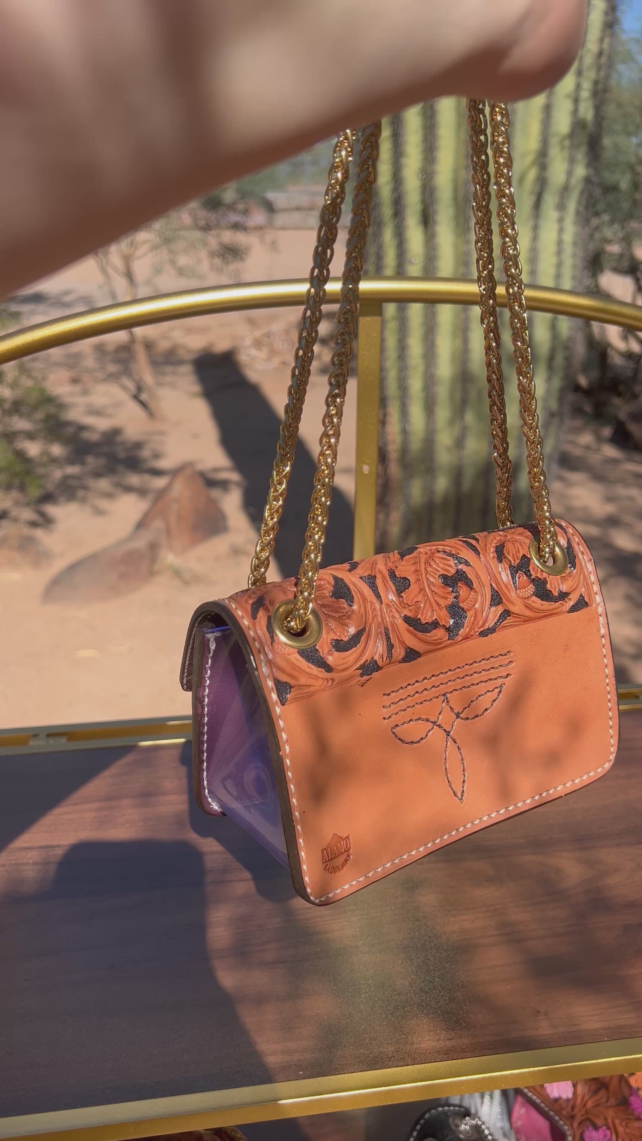 The Cowgirl clutch is NOW A MUST HAVE! With its high end design and clear underside, this stadium bag option elevate your look. Done on golden leather with full hand tooled oakleaf tooling with a black painted background, the back is clean with hand-stitch pipe work, with the famous boot stitch design. Its underside is done on thick, high-end PVC material, making this CLEAR, and STADIUM APPROVED. Finished with gold hardware and a weighted designer chain that is 47" long and can double as a shoulder bag or clutch.