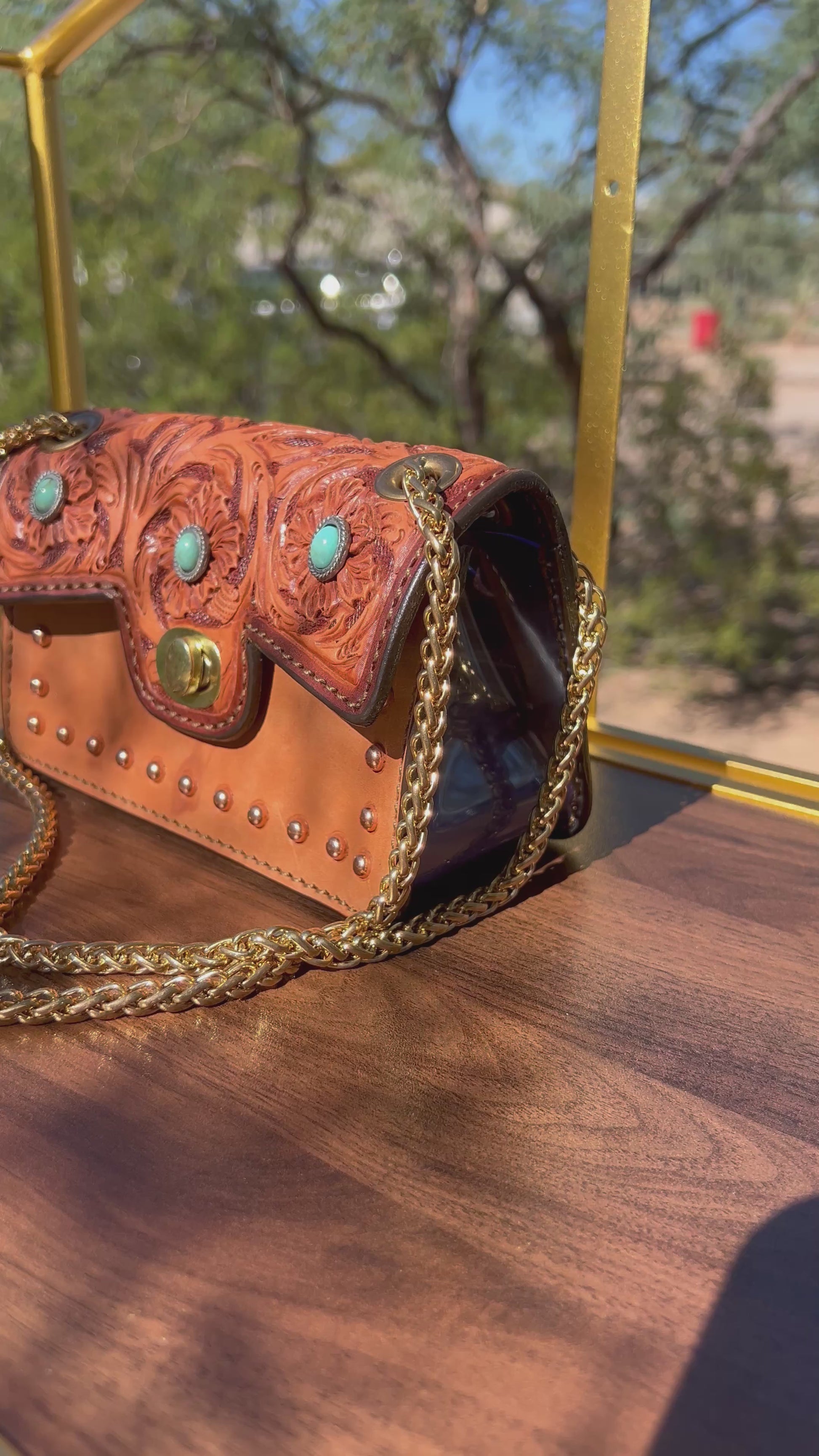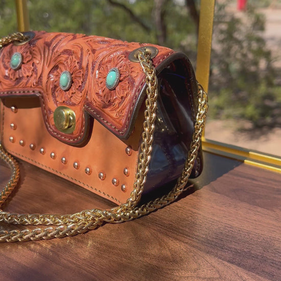 Handbag toast leather leather with gorgeous hand floral tooling . It has an adjustable designer chain. You have the option to have a short chain or long chain when wearing this. These are NFR & STADIUM APPROVED! With its clear material on the sides and the bottom of this clutch!