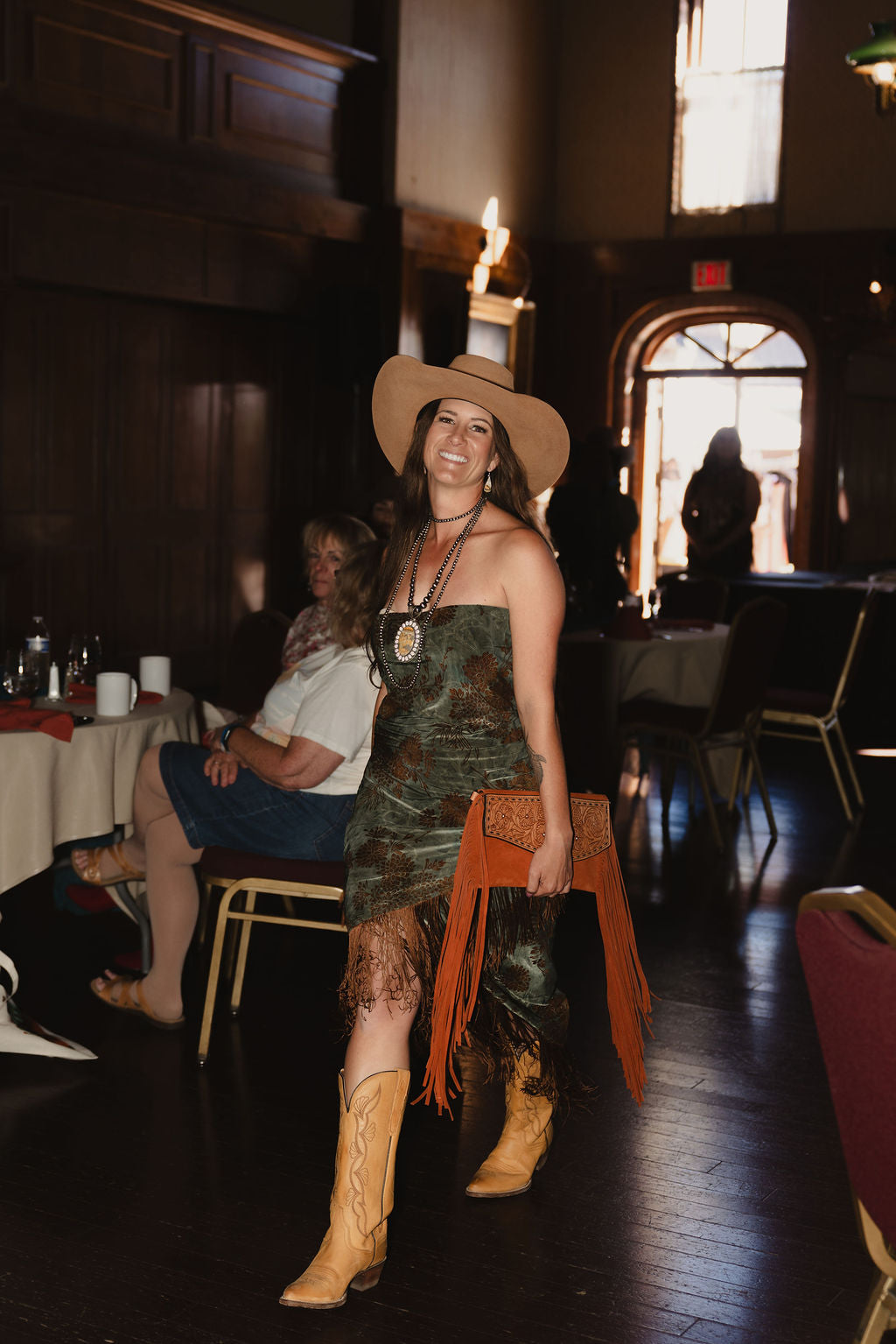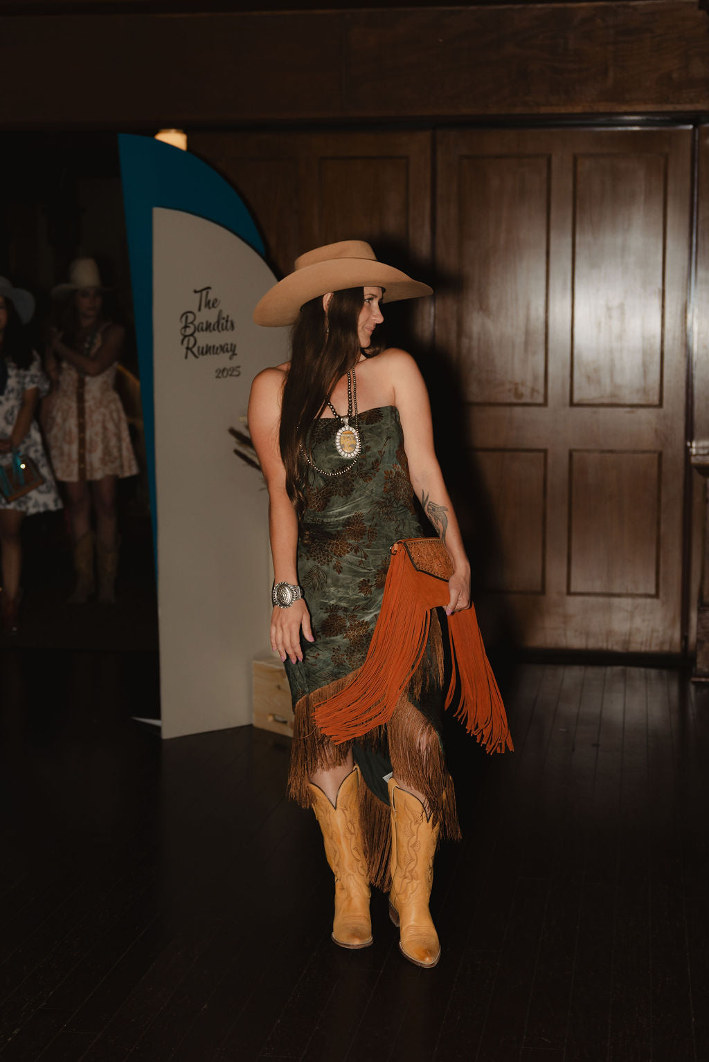 This green strapless midi dress exudes western elegance with its asymmetrical neckline and playful brown details and fringe hem that moves with you. HOT seller, and can not be restocked. Once it's gone, it's gone!